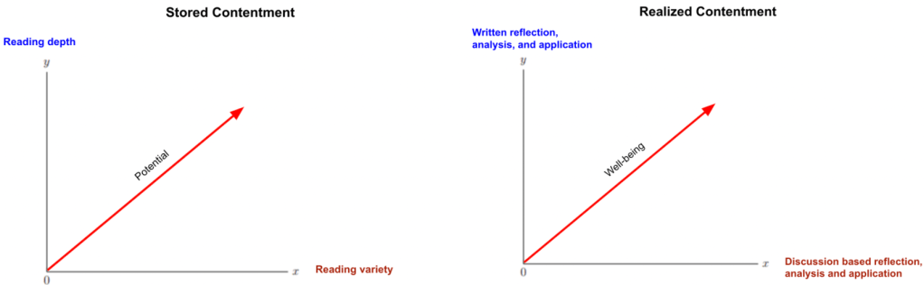 The Stored graph speaks to the importance of reading in so far as it aids in the accumulation of knowledge. As we learn more and more across domains, we build up stores of information in the same way that water builds behind a dam. Setting aside for the moment that learning for the sake of learning can be its own reward, the key benefit to stockpiling intelligence in this way is the potential that this intelligence can generate for you in the form of creative connection making, insight, and improved cognition, the effects of which can result in, as per the trajectory of the red line, an increase in one’s sense of well being.